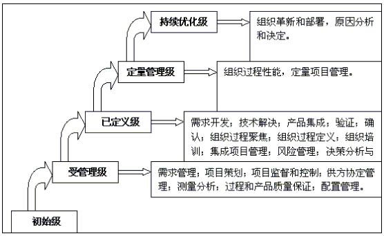 而SJ/T 11235 的主体实施内容是和国际上的CMMI标准相一致的,他主要参考了CMMI模型中SW和SE模型组件,是一种分级模型。(与之对应的信息产业部标准SJ/T11234是参照CMMI连续模型编写)共分为五个成熟度等级:第1级:初始级;第2级:受管理级;第3级:已定义级;第4级:定量管理级; 第5级:持续优化级。从2级到5级都是有诺干个过程方面组成。如图1所示。