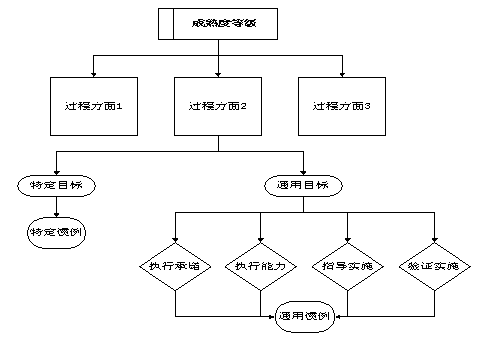 每个过程方面的实现,用相应的一组目标(通用目标和特定目标)来衡量。模型中为每个目标规定了相应的一组惯例(通用惯例和特定惯例),通过实施这些惯例来达到相应的目标。换句话说,如果针对某个成熟度等级,实施了该等级定义的各个过程方面的各个惯例并且达到了目标要求,也就表明软件能力达到了这个成熟度等级。围绕成熟度等级的过程方面、目标和惯例等是构成模型的部件。除了过程方面、目标和惯例外,模型中还包含子惯例、典型工作产品、详细说明、示例以及引证,它们也是本模型的组成部件。模型的概念见图2。
