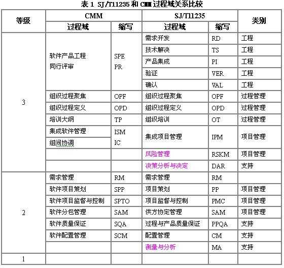 SJ/T11235是国内专家参照CMMI分级模型编写一个软件开发标准。他和SW_CMM有许多共同点,但在内容和表现形式上却有所不同,她包含了SW_CMM过程要求,强调和规范软件企业开发的更多的过程要素。同时,他是国内专家综合考虑了我国国情而编写的一个标准,她将更加适合指导我国软件企业的生产开发活动。