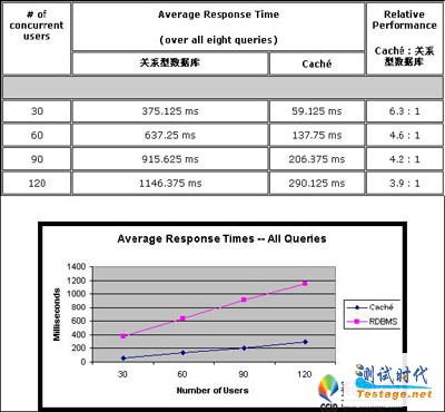 某医疗软件供应商进行了一个在 Caché 和某著名关系数据库之间的 SQL 响应时间的测试。使用的是历史病人的数据( 7 张表,超过 650 万条纪录),模拟负载 30 、 60 、 90 和 120 个并发用户的情况下运行 8 个查询。