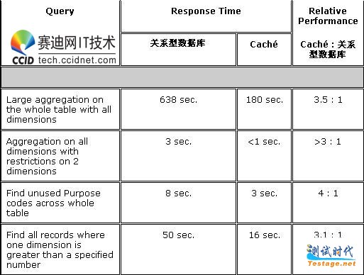 从文本文件载入关系数据库需要将近 10 个小时和 60GB 的磁盘空间。而 Caché 仅仅需要将近 45 分钟和 2GB 的磁盘空间。因为 Caché 数据库在磁盘空间的使用上极其有效,它哈能更好地使用缓冲存储器。结果,查询的响应时间 Caché 比关系数据库快很多: