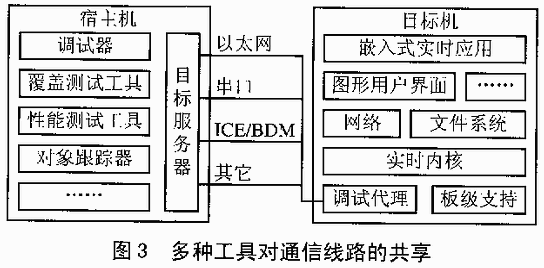 嵌入式应用程序的开发通常采用交叉开发方式,几乎所有的开发工具均要解决3部分的问题:宿主机部分的功能、目标机部分的功能、宿主机与目标机的连接问题。其中,宿主机与目标机的连接是个瓶颈,如果不同的工具要使用同一物理线路实现数据传输,则要解决对该物理线路(或者说硬件端口)的正确共享。比如在图3所示的环境中,宿主机方的各种工具通过统一的接口——目标服务器(target server)实现对通信线路的访问,目标机方的调试代理(debug agent)则是各种信息(调试信息、覆盖信息、时间信息、对象信息等)的收集与传递的核心。