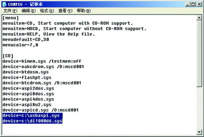 在纯DOS下使用优盘是通过加载优盘通用DOS驱动文件usbaspi.sys、di1000dd.sys实现的。首先制作一张启动软盘,下载后先将这两个驱动文件拷贝到软盘根目录下。然后用记事本编辑启动软盘中的config.sys(如果没有,请用记事本新建),添加如下内容: