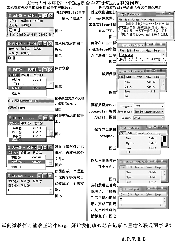 就是关于在记事本中输入“联通”会变样的问题,我在我制作的图片中作了详细的介绍。(当然,为了不多占用论坛空间,我还是按照惯例,将图片储存为黑白的Gif格式,质量不是很好,大家将就着看吧。)真不知道微软什么时候能修复这个Bug,好让我们放心地在记事本中输入'联通“二字?