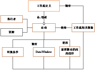 工作流元模型包含了工作流定义、活动、转换条件、工作流相关数据、执行者、资源、需要激活的应用程序、数据窗口等基本实体,如图2。