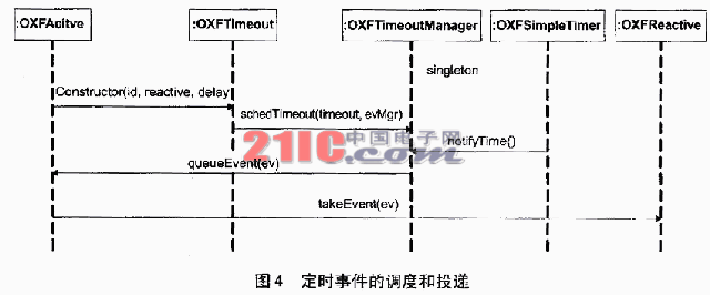 事件管理器创建一个OXFTimeout对象并将其交由一个定时管理器管理。定时管理器可以管理多个定时事件,它运行于自己的独立线程内且聚合了一个定时器对象。定时器对象每卫固定的时间片会向定时管理器发通知信号,这时定时管理器检查它管理的定时事件集合中是否有定时事件到时,并将到时的定时事件添加到事件管理器(活动对象)的事件队列中(通过调用queueEvent),之后事件管理器再将这些定时事件投递给对应的响应对象。定时事件本身是被动的,它不包含定时器。