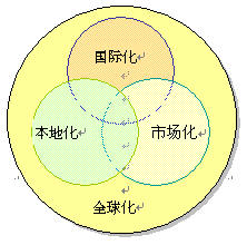 从图中可以看出,全球化软件(也称为国际化软件)包括软件国际化、软件本地化和市场服务等过程,即一个完整的软件全球化将包括软件进行正确的国际化设计,软件本地化集成,以及在全球市场进行的市场推广、销售和支持的全部过程。