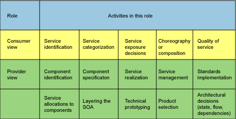 图 4显示了通过提供者和消费者的每个角色来管理的活动。注意,提供者的活动是消费者活动的父集(例如,提供者同样参与服务鉴别、分类等)。在许多情况下,角色的区别来自如下的事实,消费者指定他们想要的服务,经常的搜索它,并且一旦他们确信和他们寻找的服务规范相匹配,并且是由服务提供者提供,他们就会根据需要绑定和调用服务。提供者需要依次发布他们想要支持的服务;即在功能方面,更重要的是在消费者所需的 QoS 方面。这个在消费者和提供者之间的隐含的契约可能在 SLA 方面成熟为明确的契约;自动的或者通过业务和合法区域来处理。
