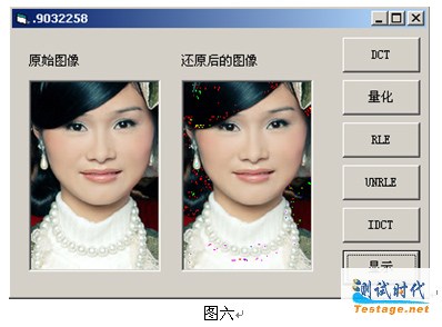 8.3、在进行IDCT的时候,由于事先对数据进行过量化,造成了一部分数据失真,因此在IDCT后,可能会由于误差的原因导致出现有数据为负数或者是大于255的数据。这样的数据如果参与颜色的计算和显示的话,将会导致还原后的图像中出现难看的杂色像素,如图六所示: