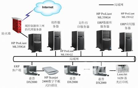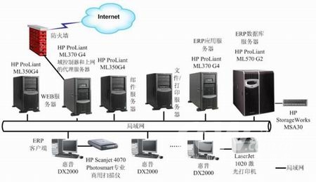 局域网50节点以内,并发应用30节点以内的中小企业,由于网络规模不大,局域网数据吞吐量较小,在功能服务器的设置上采用HP ProLiant ML150 G2作为企业中心域控制器、内部文件服务器和上网的代理服务器,在保障企业通畅连接互联网的同时,确保应用数据的安全,将应用服务器和数据库服务器同时放在一台HP ProLiant ML150 G2服务器上。