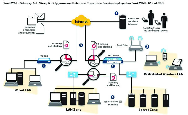 为此,美国SonicWALL公司推出了全新设计的PRO系列和TZ系列UTM网络安全设备。SonicWALL采用独一无二的逐个包扫描深度包检测引擎专利技术(美国专利申请中),无需对数据包重组及对文件进行缓存就可以实现对病毒和入侵的扫描和防护,所以SonicWALL对同时下载的文件数目和文件的大小没有任何限制。SonicWALL直接在安全网关上匹配全面的签名库,对网页下载、邮件传输及压缩文件的潜在威胁进行安全扫描。SonicWALL UTM设备能够并行扫描超过50种协议上的25000种病毒,检测并阻断(根据管理员的设置)超过2000种入侵威胁。