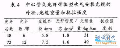 表4给出了这种48或72芯中心管式光纤带微型吹气安装光缆的外径、光纤密度、光缆重量、抗拉强度.这种光缆的正常工作温度范围为-40~70℃.