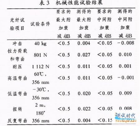 机械性能试验是按照美国标准Telcordia GR20对金属加强和非金属加强全干式中心管光纤带光缆进行试验,以验证其是否满足机械性能要求.表3列出了直径为18.5 mm的216芯非金属全干式中心管光纤带光缆,在各种机械试验条件下的附加衰减变化情况.从表3可以看出,这种光缆的附加衰减远远小于GR20的规定值.