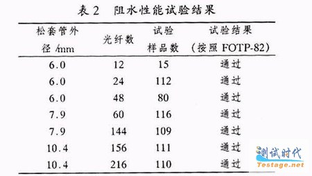 阻水性能试验就是用一系列渗水试验来验证纤用高级吸水膨胀阻水带是否能阻止水在中心管内具有的大空间的渗透.具体的做法是将光缆试样放置于1 m静压头下,让水静压头作用到多个缆芯试样上,以满足光缆阻水性能标准规范要求.表2列出了全干式中心管光纤带光缆的阻水性能试验结果.