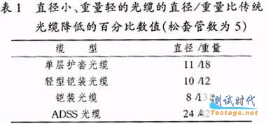 针对目前光纤通信工程中,光缆结构发展趋势呈现出以管道光缆为主,直埋光缆和室外架空光缆为辅的格局.人们自然会想是否可以将对光缆结构的重型保护移植到管道上或选择其他的光缆材料,这样做既可以降低光缆成本(减小光缆尺寸,降低光缆重量),又可以节约施工费用(节约管道空间和施工更简便).美国OFS BrightWave Carrollton的Richard.G.Gravely的论文[1]指出减小松套管光缆尺寸和重量的办法是:(1) 在保证光缆耐低温弯曲和机械性能稳定的前提下,设法减小松套管和中心加强件的尺寸;(2) 减小护套和皱纹金属覆膜带厚度.这种方法适用于全介质单层护套光缆、轻型铠装光缆(单层护套、单层铠装)、铠装光缆(双层护套、单层铠装)和短跨度接入ADSS光缆.例如,他们研制的144芯单层护套小直径管道光缆的直径仅为13.4 mm,而典型商用144芯单层护套管道光缆的直径为18.8 mm.表1给出了与传统光缆相比,直径小、重量轻的光缆的直径、重量降低的百分比数值.