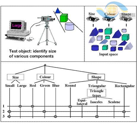 在第一个步骤中,测试人员需要确定与测试相关的方面。每个方面应该有精确的限制,从而可以清晰地区别测试对象的可能输入。例如,上图中的大小(Size)、颜色(Colour)、形状(Shape)共同组成了测试对象的可能输入的方面。