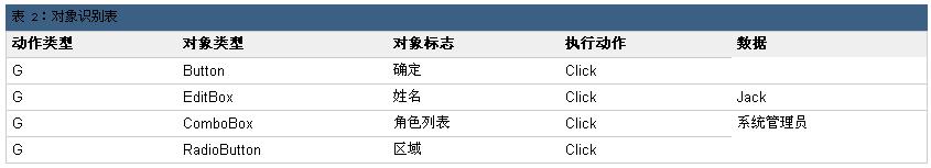 根据IBM Rational Robot识别对象并执行操作的要求,如果要让Robot找到界面上的对象并执行相关动作,需要给Robot指定每个对象的对象类型、对象标志、执行动作和数据,如下图所示。