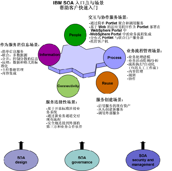 之前讨论的五个 SOA 切入点直接映射到(即具有一对一关系)本列表中的前五个场景。(例如,重用直接映射到服务创建,而连接性直接映射到服务连接性。)我们还将讨论其他 SOA 场景,这些场景均以上面的五个切入点为基础。即 SOA 设计、SOA 治理与 SOA 安全性以及管理。