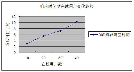 针对基于在线用户数的性能测试需求,可通过下图总结性能测试结论。其中横轴是在线用户数,纵轴是响应时间,如40在线用户访问网上购物系统时,90%的下定单请求响应时间不超过10秒。