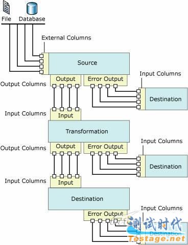 与控制流不同,数据流对象主要描述的是数据在点与点之间的转换。这里转换的都是数据,每个点都是一个逻辑的数据点(内存中逻辑的或者是介质上物理的)。SQL Server 2005中支持大量的数据源类型,同时借助.Net的扩展机制完全可以采用类似扩展ADO.Net Data Provider类似的办法扩展数据源。数据流的逻辑示意结构如下: