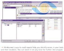 一旦测试运行后,您就需要分析测试结果。WinRunner的互动式报告工具会列出在测试中发现的错误和出错的位置。通过提供这种详尽的,易懂的报告,WinRunner可以帮助您解释所得的结果,这些报告对在测试运行中发生的重要事件进行描述,如错误内容和检查点等。点击按扭,您还能进一步获取详尽的详细资料。这些结果都可以通过Mercury Intreactive的测试管理工具TestDirector® 来查阅。