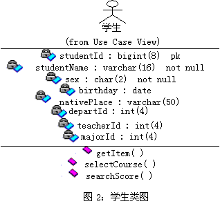 在图2的学生类图中,包括学生类的属性和方法。例如:studentId是学生的学号,且数据类型为bigint(8),且为主码;selectCourse(courseId : bigint,studentId:bigint)return int,是类的方法,其入口参数为课程编号courseId和学生学号studentId,此方法作用是学生进行选课。