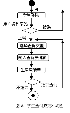 此外,描述工作流和并发处理行为还可以用活动图,表达从一个活动到另一个活动的控制流,顾序图和协同图适合描述多个对象的协同行为,而状态图适合描述一个对象穿越多个Use Case的行为。状态图与活动图的区别是:状态图描述的是对象类响应事件的外部行为。活动图描述的是响应内部处理的对象类的行为。图3是学生查询成绩的活动图。
