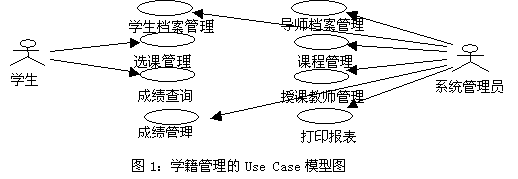 图1中模型元素之间的实线表示二者存在关联关系,是学籍管理系统层的Use Case模型,只包含了最基本的Use Case模型,是系统的高层抽象,在开发过程中,随着对系统的认识不断加深,Use Case模型可以自顶向下不断精化,演化出更为详细的Use Case模型。