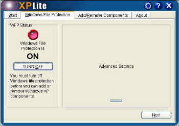 可以看到,XPLite的界面非常简单,只有Start、Windows File Protection、Add/Remove Components和About四个部分(图1)。