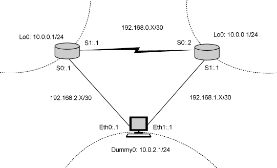 10.0.0.0/24 is subnetted, 3 subnets R 10.0.2.0 [120/1] via 192.168.2.1, 00:00:11, FastEthernet0/0 C 10.0.0.0 is directly connected, Loopback0 R 10.0.1.0 [120/1] via 192.168.0.2, 00:00:18, Serial0/0 192.168.0.0/30 is subnetted, 1 subnets C 192.168.0.0 is directly connected, Serial0/0 192.168.1.0/30 is subnetted, 1 subnets R 192.168.1.0 [120/1] via 192.168.0.2, 00:00:18, Serial0/0 [120/1] via 192.168.2.1, 00:00:11, FastEthernet0/0 192.168.2.0/30 is subnetted, 1 subnets C 192.168.2.0 is directly connected, FastEthernet0/0