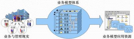 业务建模的过程,是从业务和管理的现实和知识出发,依据和参照业务模型体系,采用业务建模工具,设计并构建出相关的业务模型资源,业务模型资源是业务建模的主要产品。