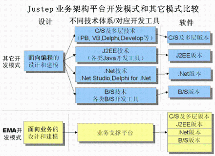 Business Studio是跨越代码和实现技术来运行企业业务,开发者只需关注企业的流程、机构和业务逻辑,而无需关心这些业务是用何种技术实现。比如,Justep Business业务平台在设计完成企业业务模型设后,用户可以得到C/S,多层体系和B/S等多种运行方式,基于EJB、DCOM等不同实现技术的业务软件。
