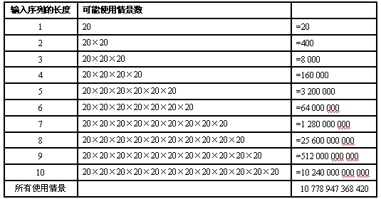 拥有边界约束但存在大量输入序列的软件会具有一个有限却十分庞大的可能使用情景。就像下面(来自 Wiener 1994)的表的例子所示,随着可能输入序列的组合的增长,会导致大得惊人的测试数自。该例子假定:(1)系统中的一个使用情景至少可以有1个输入,并且至多可有10个输入;(2)允许20个不同的输入;(3)输入允许重复。这样的系统就今天的标准来说的确不算大。