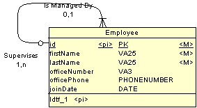 有些时候,你可能要定义自我引用的表。自我引用的表一般用来描述层次型关系。如下面的图形所示,大多数数据建模工具能够处理这类关系。注意在这个例子中,雇员可以有零个或者一个上级——它使你能够处理一些特殊的情况,比如总统没有直接的上级。