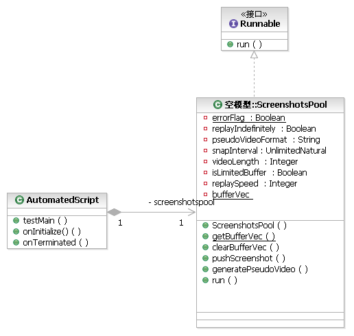 本例中给出的代码主体ScreenshotsPool将以线程的形式运行,独立于自动测试脚本的回放,因此实现了Runnable接口中的run()方法。(见图四)