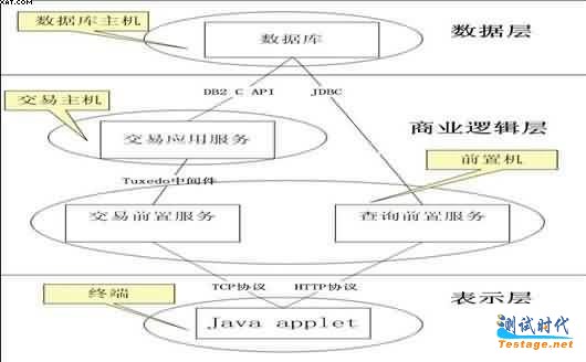 首先,从终端到前置机,终端产生业务报文发送至前置机,前置机上运行查询前置服务和交易前置服务,查询前置服务向下通过HTTP协议以WEB服务形式和终端连接,向上通过JDBC直接与数据库系统相连。交易前置服务向下通过基于TCP协议的socket连接和终端通讯,向上通过tuxedo jolt客户端和交易应用服务连接。交易应用服务进行业务逻辑计算,并操作数据库系统。