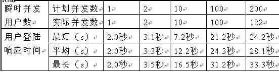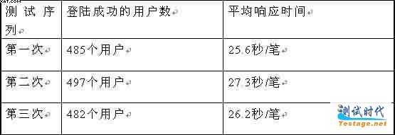 注:这里的登陆成功用户指的是系统接受了登陆请求,并建立了连接。平均响应时间在登陆脚本里设置检测点,由loadrunner工具自动获得。
