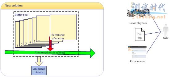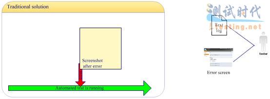 该方案向测试人员提供了一副描述错误现场的截图,以及文本形式的执行日志。为了找出导致错误发生的确切原因,测试人员需要追踪并分析执行日志,截图反映了发生错误当时的情形,但对于之前过程的反映,却相当有限。