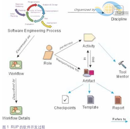 在RUP中,整个软件开发过程如图1所示,它以指定的工件为输入,通过软件开发角色和标准化的软件开发活动,生产出满足质量要求的输出工件。