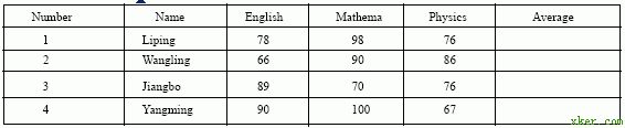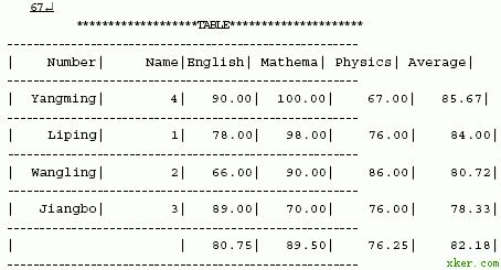 / * 输出效果为:| Name| Number|English|Mathema|Physics|Average|*/