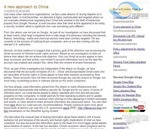 谷歌高级副总裁、公司发展和首席法律官David Drummond在谷歌官方博客上发表文章“A new approach to China”,谈及谷歌目前对于中国运营的看法及考虑。
