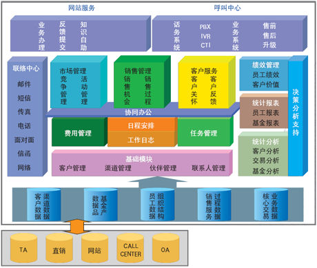 联想基金行业客户关系管理系统在基金行业已经成功实施了多家成功案例,本产品对协作型、操作型和分析型CRM特点均有所体现,其整体功能框架如下图所示: