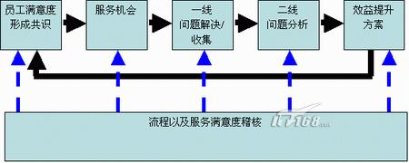 信息技术服务部门所共同追求的服务价值链是这样的:不断发现新的问题,不断提出更好的效益提升方案,不把用户提出的问题视为重复性的工作,而是把这些问题当作更好地提高服务满意度的机会,视为另一个效益提升方案的起点;越难满意的用户反而能让我们提高更多,再引进外部的神秘访客,不断地提高服务意识以及质量。
