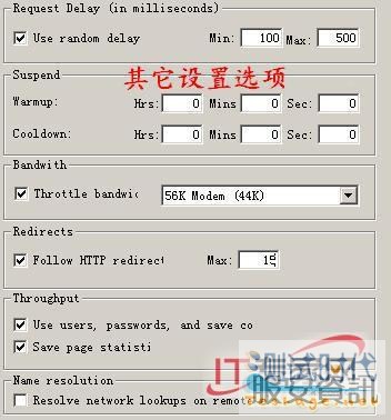 “Rpquest Delay”设置延迟时间,我们设置为100~500。“Suspend”设置设定挂起时间,Warmup时间是初始化测试运行时间,cooldown时间就是指定结束阶段的测试时间。Bandwith”指定带宽瓶颈,允许你模拟从14.4 Kbps的modem连接到T1 (1.5 Mbps)的Local Area Network (LAN)连接的网络带宽。Redirects设置重定向时间,“Throughput”设置用户、密码页面状态保存等是否启用,“Name resolution”设置是否进行名称解析。所有以上的选项大家可以根据自己的需要进行设置。(图3)
