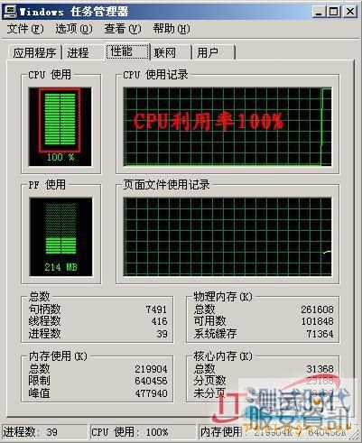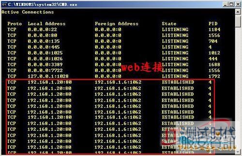 第二步:在“Settings”的功能设置中将Stress level (threads)线程数设置为1000。完毕后,点工具中的灰色三角按钮即可进行测试。测试过程中我们可以从服务器的任务管理器中看到CPU使用率已经 达到100%,损耗率达到最大见图5。在CMD窗口中使用命令netstat -an,可以看到客户端的IP地址在服务器上的80端口进行了非常多的连接见图6,而且Web网站已经打不开了,提示过多用户连接。(图5)(图6)