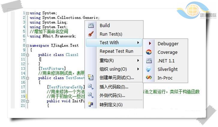TestDriven.NET是以插件形式集成在Visual Studio IDE中的单元测试工具,完全兼容所有.NET Framework版本,并且集成了多种单元测试框架诸如NUnit,MbUnit,以及 MS Team System 等。 TestDriven.NET的前身是NUnitAddIn。