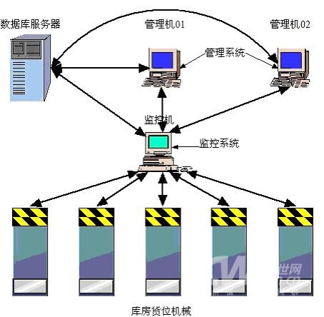 监控系统:处于立体库系统的第二层,是系统管理员用于监控库房中各个机械设备运转情况的计算机系统。监控系统安装在一台专门的监控计算机上,向上与管理系统相连,实时接收管理系统发送来的入出库信息,并反馈相应的执行信息;向下与机械设备的控制电路相连,将入出库信息解释分解为控制信号发送给底层机械设备控制其运转,并接收机械设备的各类反馈信息,提供给系统管理员参考。