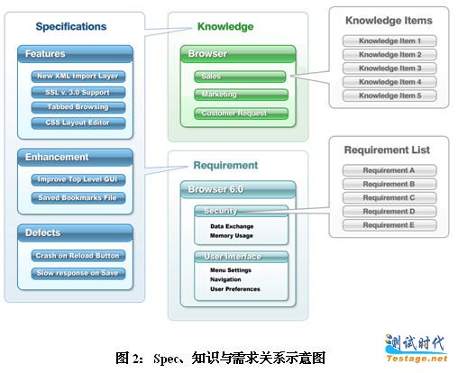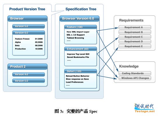 通常情况下,Spec包含功能、缺陷和功能增强三个部分,他们都来源于相关的知识或需求,并与需求条目和知识库中的知识条目相关联。图2以Browser 6.0产品为例,用图形化的方式显示了Spec与知识、需求的关系。针对Browser产品的最新版本6.0,有安全和用户界面两大类需求,通过需求分析师将其分解为新的功能,如支持SSL v.3.0、Tabbed Browsing等;除新功能以外,Spec还包括对之前版本的功能增强,如保存已标记的文件;以及上一版本的缺陷,如保存时响应缓慢。这些Spec通过规划、编码、测试等工作,构成最终交付的产品。