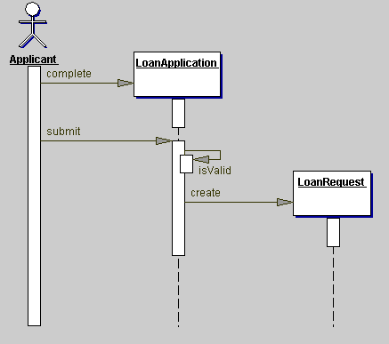 在此方案中,申请人与贷款申请交互两次,第一次是完成它,而第二次是提交它。当 LoanApplication 接收到 submit 消息时,它会通过将 validate 消息发送到自身来验证它自己。如果有效,则它会创建要发送到商业资信咨询机构的新 LoanRequest。图 4 显示了 LoanApplication 的验证过程。