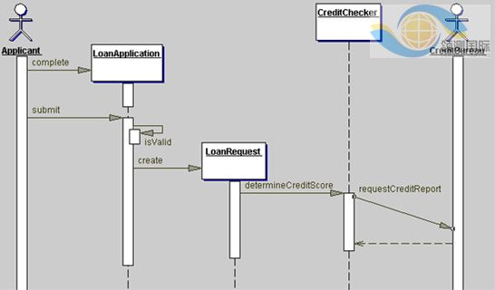 在此示例中,商业资信咨询机构是一个外部系统,它是具有服务器角色的参与者(有关详细信息,请参阅关于参与者角色)。服务器通常不生成消息,但会有发送给它们的消息 -- 在本例中是由信用检查器发送的信用报告的请求。信用检查器代表了商业资信咨询机构。它跟踪请求并将请求转发给商业资信咨询机构,跟踪并接收响应,此外就是建立贷款处理应用程序和商业资信咨询机构之间的连接。商业资信咨询机构将接收请求,并根据它自己的时间表处理请求。我们使用斜向箭头表示这段时间的流逝,如以下的图 5 所示。